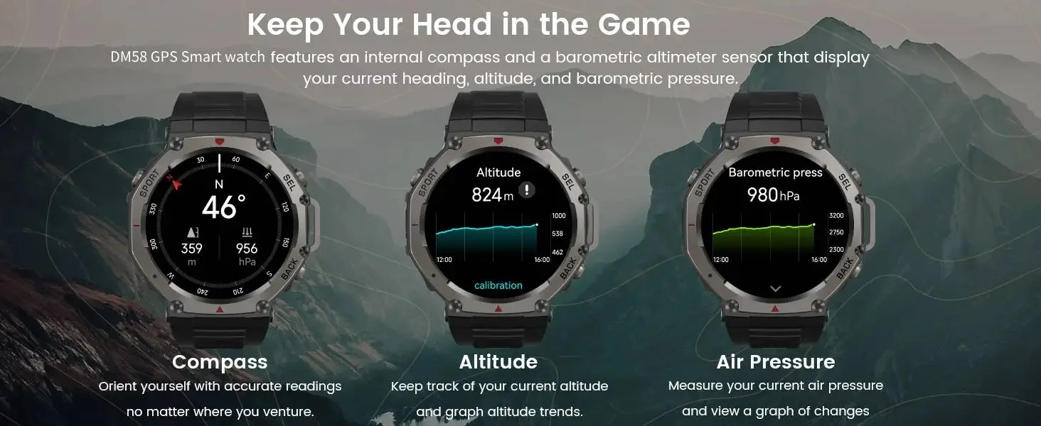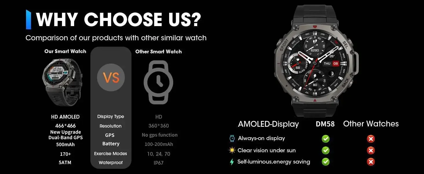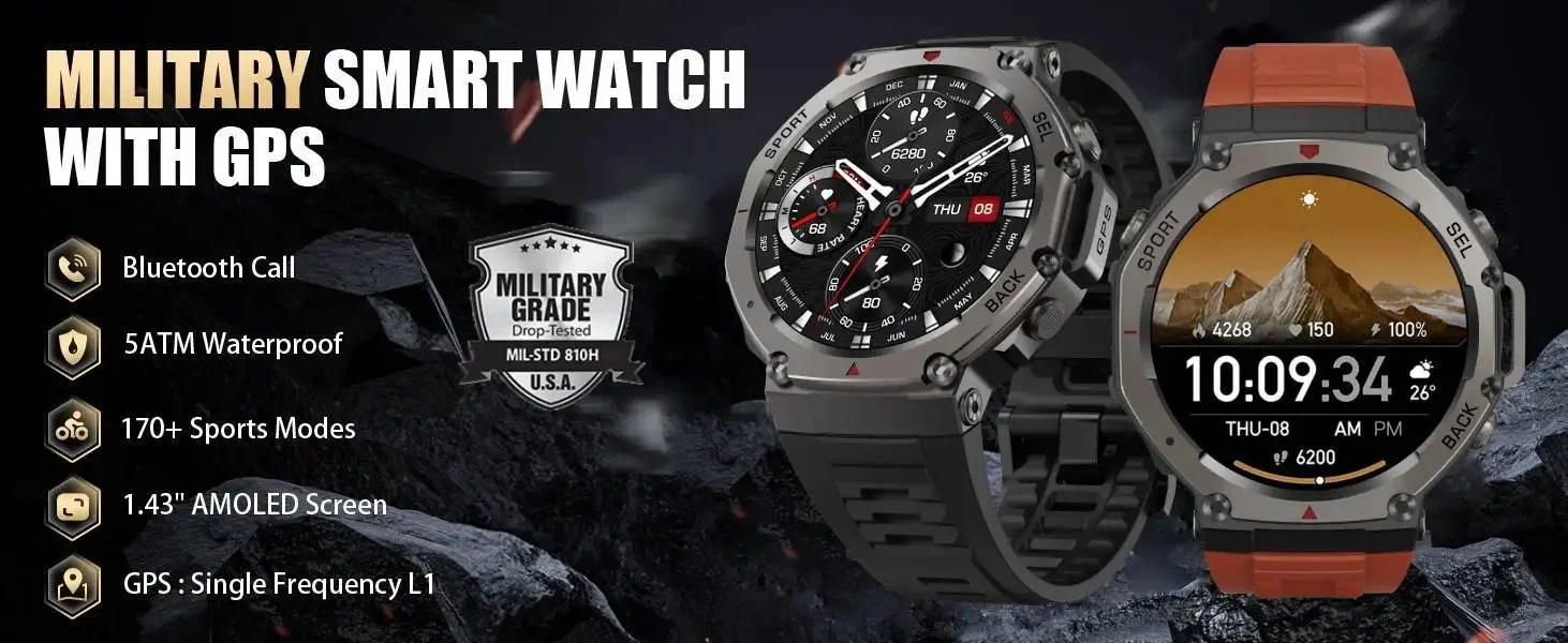 | T-Rex 3 GPS Smart Watch Men Built-in Dual Band GPS Compass Altimeter Barometric 5ATM IP69K Waterproof AMOLED Smartwatch | KAVSUMI Tank GPS Smart Watch Built-in Compass Barometric Altimeter Dual-band GNSS Voice Calling Smartwatch 10 ATM |